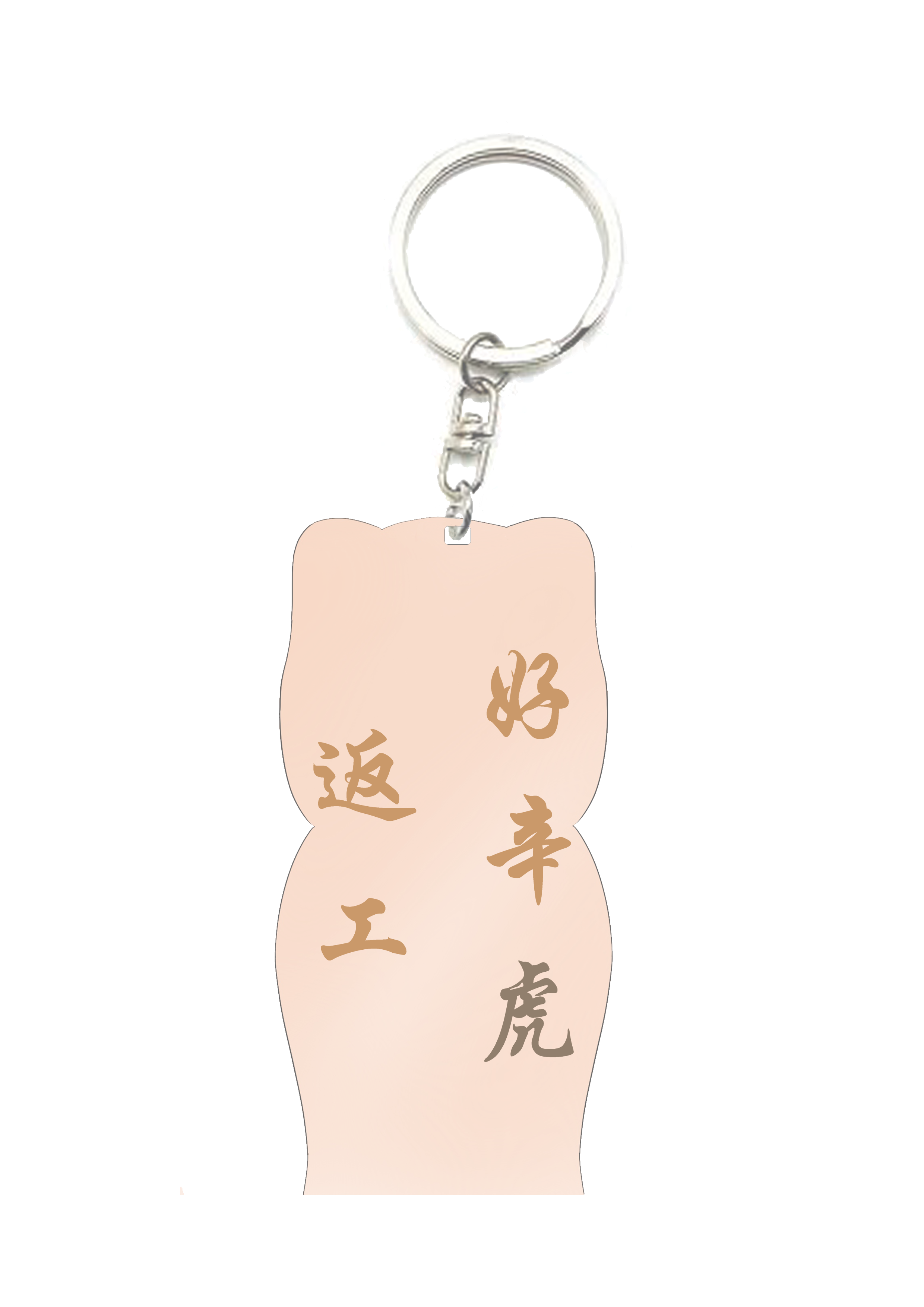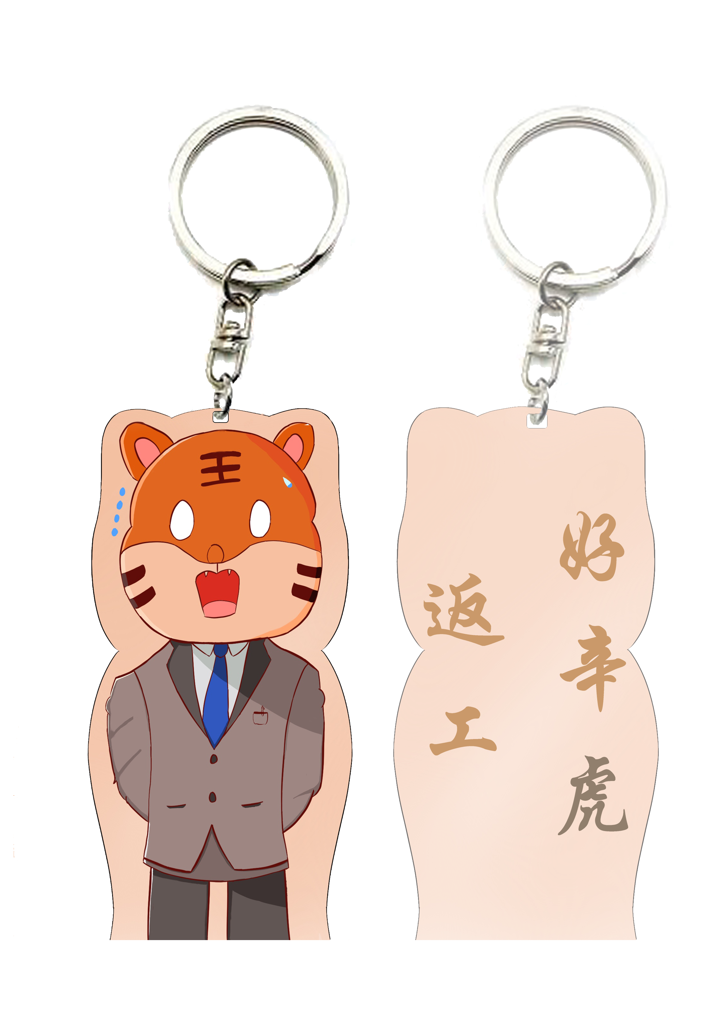 鑰匙扣的正面是上班族的卡通人物,以輕鬆的一面表達工作時的煩惱。背面則是「返工好辛虎」,道出上班族的心聲。